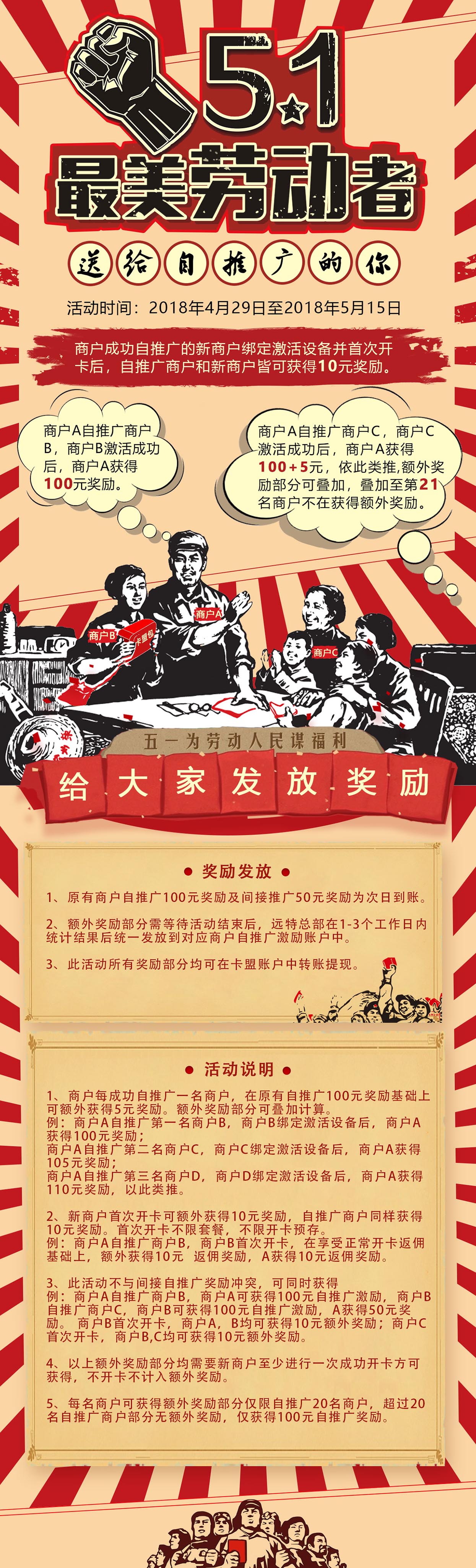 2、活动期间,商户成功自推广的新商户绑定激活设备后,新商户首次开卡可获得额外获得10元奖励,自推广商户同样获得10元奖励。