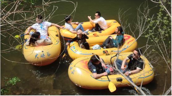 乌云遮不住太阳,雨后总是灿烂的阳光。时近中午,太阳出来了,大家也正走到峡谷尽头,很多游兴正浓的同事玩起了皮划艇,并忘却年龄打起了水仗,登岸后还意犹未尽,很多人买了水枪继续开战,衣服湿透了,心里也乐透了。追逐、打闹、欢笑融成一曲换歌,正如有的同事所说:“今天真的玩疯了,比上学时候还疯狂!”